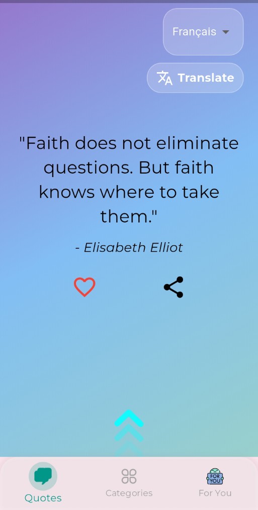A quotes app featuring multiple languages translation via Google ML Kit, dark mode support, and smooth Flutter design.
